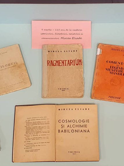 9 martie – 115 ani de la nașterea filosofului, eseistului și romancierului Mircea Eliade – expoziție de carte realizată la Compartimentul Colecții speciale. Cu această ocazie vă prezentăm și dedicația autografă a marelui scriitor pe volumul Fragmentarium, București, Editura „Vremea”, 1939, pentru George Călinescu: „Dlui G. Călinescu / această carte de controverse / timide. /…
