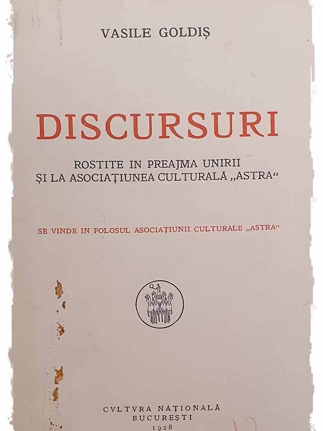 Din patrimoniul Colecțiilor speciale ale bibliotecii judeţene:„Discursuri rostite în preajma Unirii și la Asociațiunea Culturală Astra”, Vasile Goldiș, București, Cultura Națională, 1928. La 12 noiembrie 1862 s-a născut la Mocirla (Arad), profesorul, publicistul și omul politic Vasile Goldiș. A fost deputat în Marea Adunare Națională de la Alba Iulia, membru de onoare al Academiei Române…