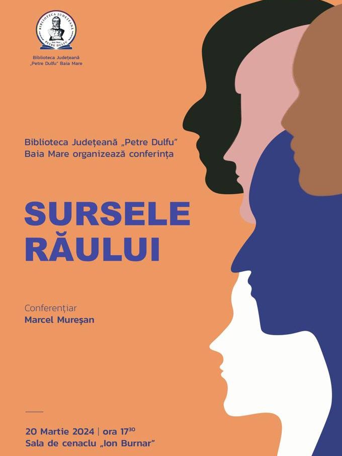 Miercuri, 20 martie 2024, orele 17:30 – 19.30, Sala Cenaclu a Bibliotecii Județene „Petre Dulfu” Baia Mare: Conferința „Provocările gândirii” – incursiune în cunoașterea omului – conferință-dezbatere. A șasea întâlnire are tema: „Sursele răului”. Conferențiar: Marcel Mureșan. … Agenda evenimentelor la Biblioteca Judeţeană „Petre Dulfu” Baia Mare, 18 – 23 martie 2024;