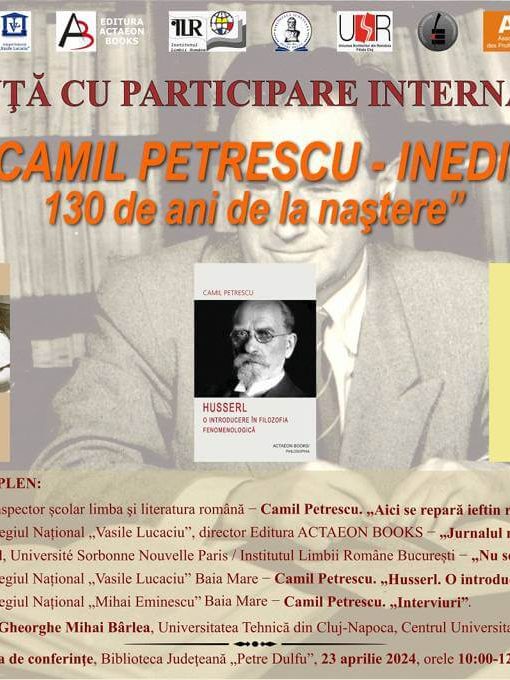 Marți, 23 aprilie 2024, ora 10.00, Sala de conferințe: În cadrul proiectului cultural – educațional „Români celebri”, va avea loc Conferința cu participare internațională „Camil Petrescu – Inedit, 130 de ani de la naștere”. Evenimentul este organizat în parteneriat de Inspectoratul Școlar Județean Maramureș, Colegiul Național „Vasile Lucaciu” Baia Mare, Editura Actaeon Books Baia Mare,…