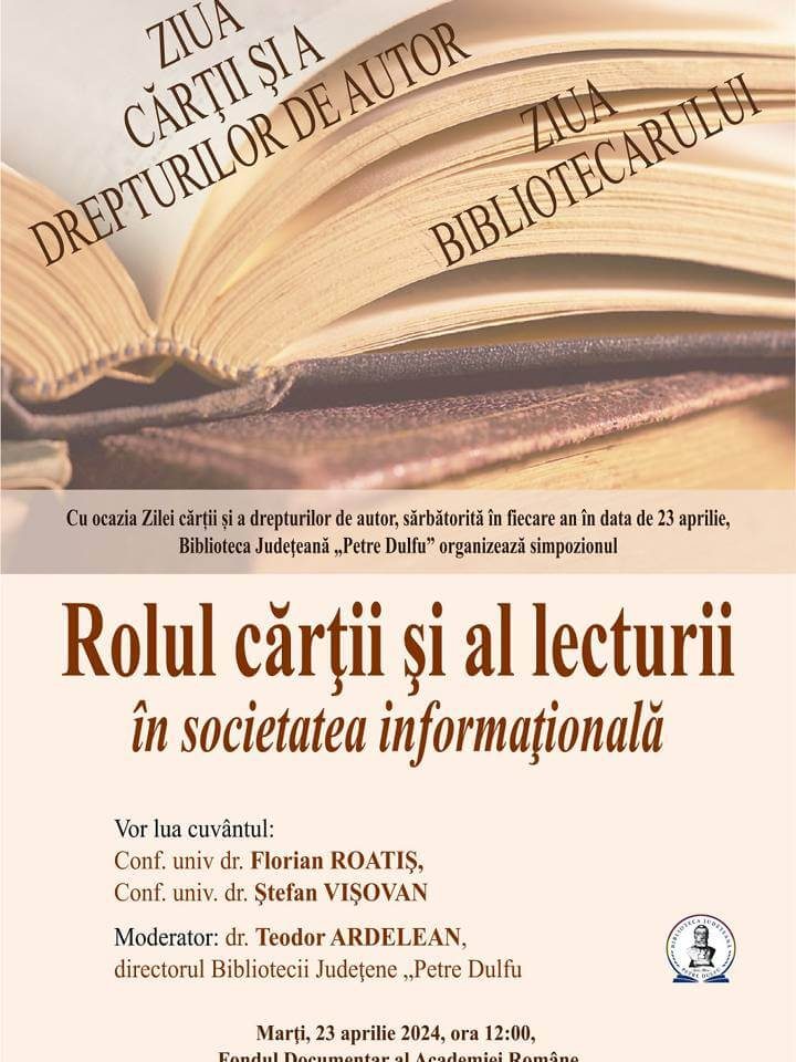 Ziua Națională a bibliotecarului și Ziua Internațională a cărții și a drepturilor de autor coincid și sunt sărbătorite, în fiecare an, pe data de 23 aprilie. Am folosit acest prilej important pentru breasla bibliotecarilor, prin marcarea evenimentului, la Fondul documentar al Academiei Române din cadrul Bibliotecii Județene „Petre Dulfu”, printr-un simpozion: „Rolul cărții și al…