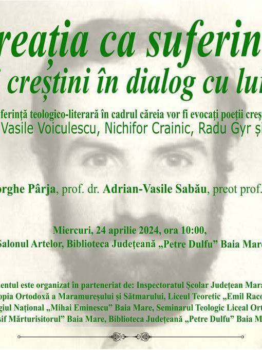 Miercuri, 24 aprilie 2024, ora 10.00 – Salonul Artelor, Biblioteca Județeană „Petre Dulfu” Baia Mare: În cadrul proiectului cultural – educațional „Între Creație și Înviere”, va avea loc Conferința „Creația ca suferință. Poeți creștini în dialog cu lumea”. Va avea loc evocarea poeților creștini: Daniel Turcea, Vasile Voiculescu, Nichifor Crainic, Radu Gyr, Tudor Arghezi, atât…