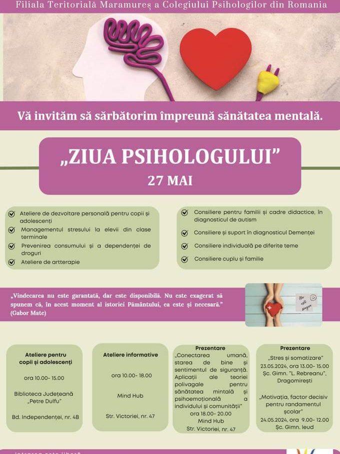 Luni, 27 mai 2024, orele 10.00 – 15.00, Sala de conferințe: Colegiul Psihologilor din România – Filiala Maramureș în colaborare cu Biblioteca Județeană „Petre Dulfu” Baia Mare organizează „Ziua psihologului”, eveniment în cadrul căruia vor avea loc ateliere de dezvoltare personală pentru copii și adolescenți, abordând următoarele teme: managementul stresului la elevii din clasele terminale,…