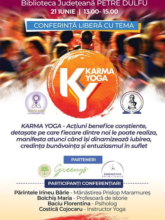 Vineri, 21 iunie 2024, orele 13.00-15.00, Sala de conferințe a Bibliotecii Județene „Petre Dulfu” Baia Mare: Vineri, 21 iunie 2024, orele 13.00-15.00, Sala de conferințe: Asociația „Eruditus animo” organizează conferința cu tema „Karma Yoga”- acțiuni benefice conștiente, detașate, pe care fiecare dintre noi le poate realiza, atunci când își dinamizează iubirea, credința, bunăvoința și entuziasmul…