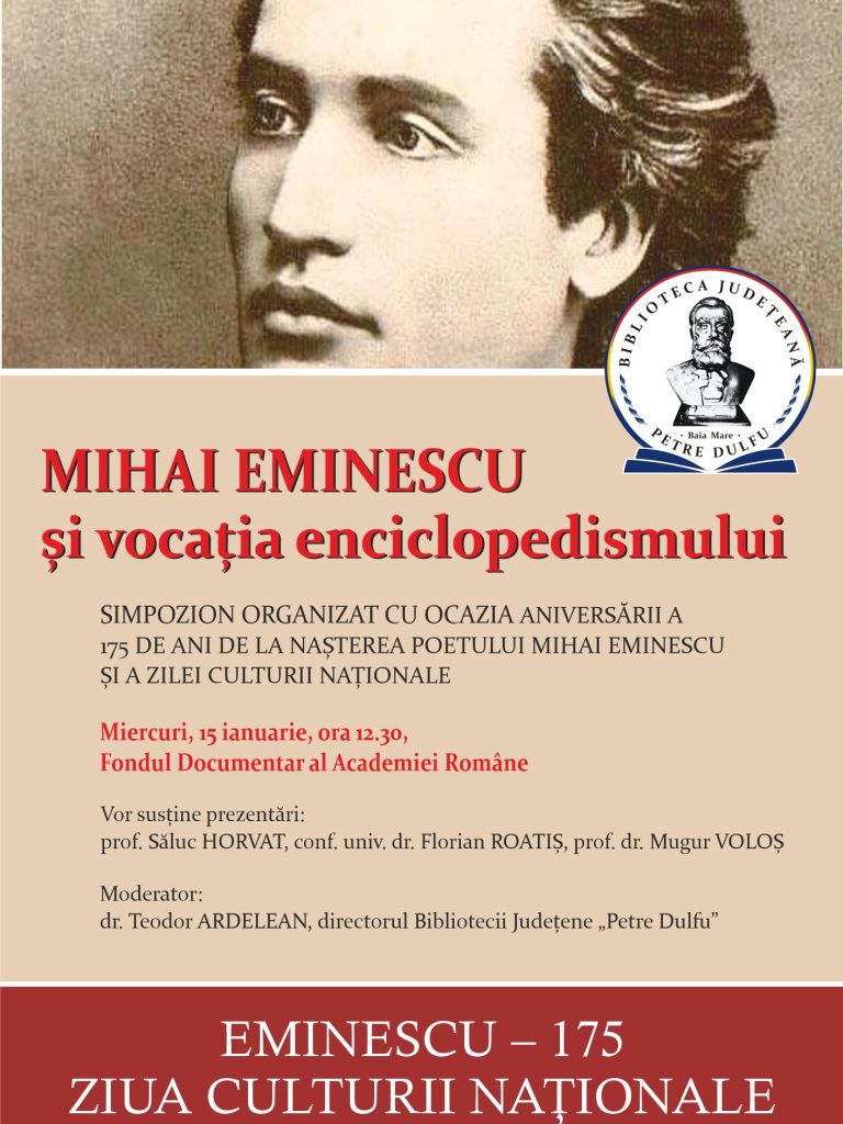 Miercuri, 15 ianuarie, ora 12.30, Fondul Documentar al Academiei Române: Cu ocazia aniversării a 175 de ani de la nașterea poetului Mihai Eminescu și a Zilei Culturii Naționale, Biblioteca Județeană „Petre Dulfu” Baia Mare organizează manifestarea „Mihai Eminescu și vocația enciclopedismului”. Vor susține prezentări: prof. Săluc Horvat, conf. univ. dr. Florian Roatiș, prof. dr. Mugur…