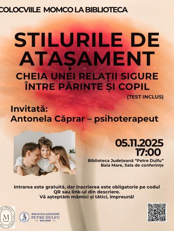 Miercuri, 5 noiembrie 2025, ora 17.00, Sala de conferințe: Asociația MomCo Baia Mare (Comunitatea mamelor) în colaborare cu Biblioteca Județeană “Petre Dulfu” Baia Mare organizează colocviul cu tema „Stilurile de atașament” – cheia unei relații sigure între părinte și copil.  Scopul acestor întâlniri este de a veni în sprijinul mamelor cu bebeluși, copii preșcolari și…