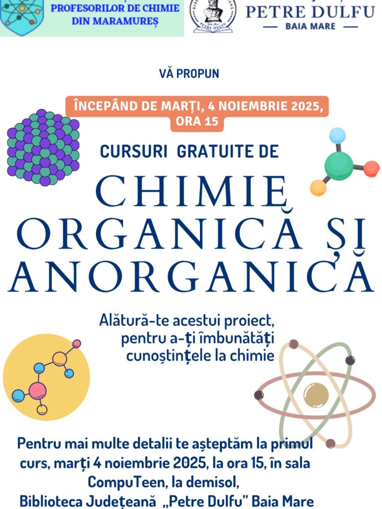 Marți, 4 noiembrie 2025, ora 15.00, Sala CompuTeen: Asociația Profesorilor de Chimie Maramureș în colaborare cu Biblioteca Județeană „Petre Dulfu” Baia Mare organizează Cursuri gratuite de chimie organică și anorganică, coordonator prof. Mariana Pop. Acestea se vor desfășura marțea, în intervalul orar 15-16.30, pe perioada anului școlar 2025-2026.