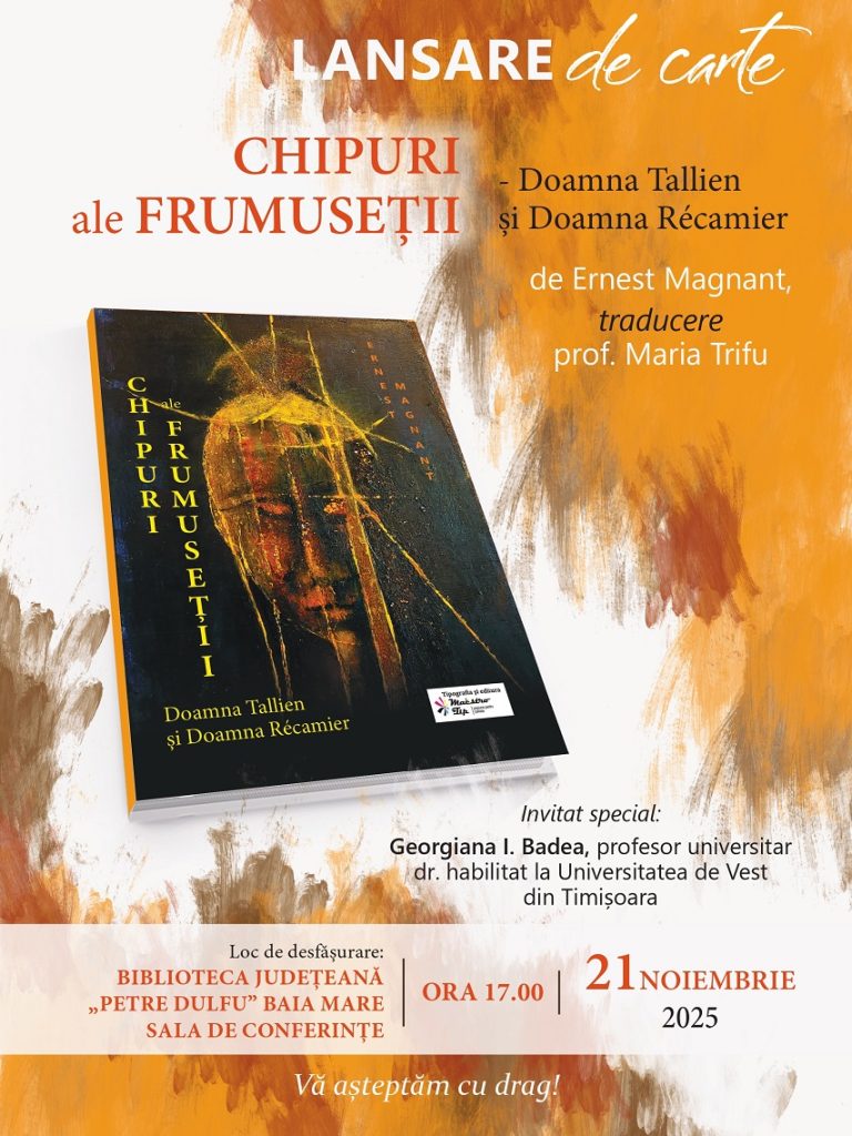 Vineri, 21 noiembrie 2025, ora 17.00, Sala de conferințe: Biblioteca Județeană „Petre Dulfu” Baia Mare organizează lansarea cărții „Chipurile frumuseții – Doamna Tallien și Doamna Récamier”, de Ernest Magnant, traducere de prof. Maria Trifu, volum apărut la Editura MaestroTip, Fersig, 2025. Invitat special: Georgiana I. Badea, profesor universitar doctor habilitat la Universitatea de Vest din…