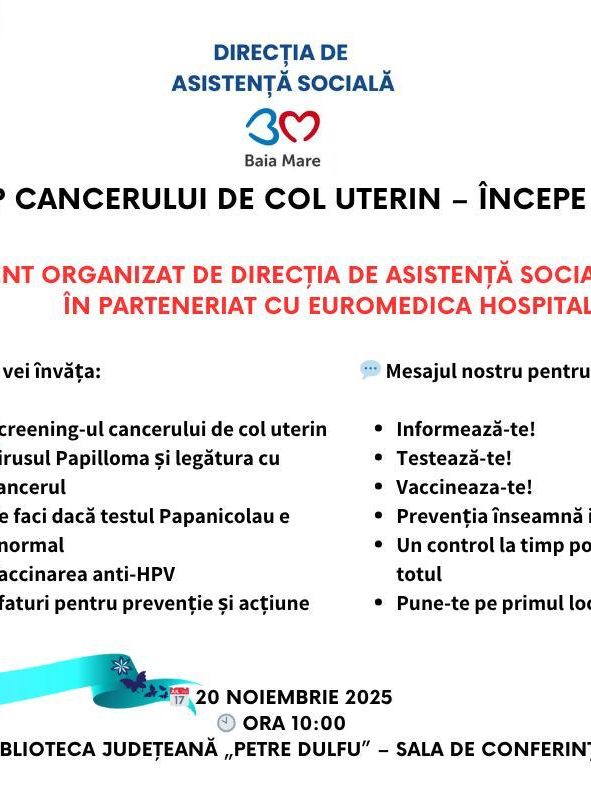 Joi, 20 noiembrie 2025, ora 10.00, Sala de conferințe: Direcția de Asistență Socială – Serviciul Logistică Medicală Comunitară în colaborare cu EuroMedica Hospital și Biblioteca Județeană „Petre Dulfu” organizează conferința intitulată „STOP Cancerului de col uterin – Începe cu tine”, o activitate de educație sanitară destinată femeilor, o campanie de screening pentru prevenirea cancerului de…