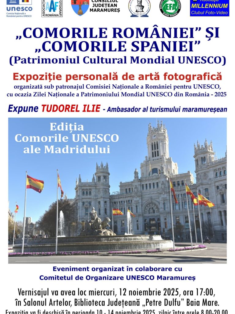 Miercuri, 12 noiembrie 2025, ora 17.00, Salonul Artelor: Va avea loc vernisajul expoziției „Comorile României” și „Comorile Spaniei” (Patrimoniul Cultural Mondial UNESCO”), autor artistul fotograf Tudorel ILIE, ambasador al turismului maramureșean. Cu acest prilej se va sărbători Ziua Națională a Patrimoniul Mondial UNESCO din România – 2025 (16 noiembrie). Expoziţia va fi deschisă în perioada 10 – 14 noiembrie…