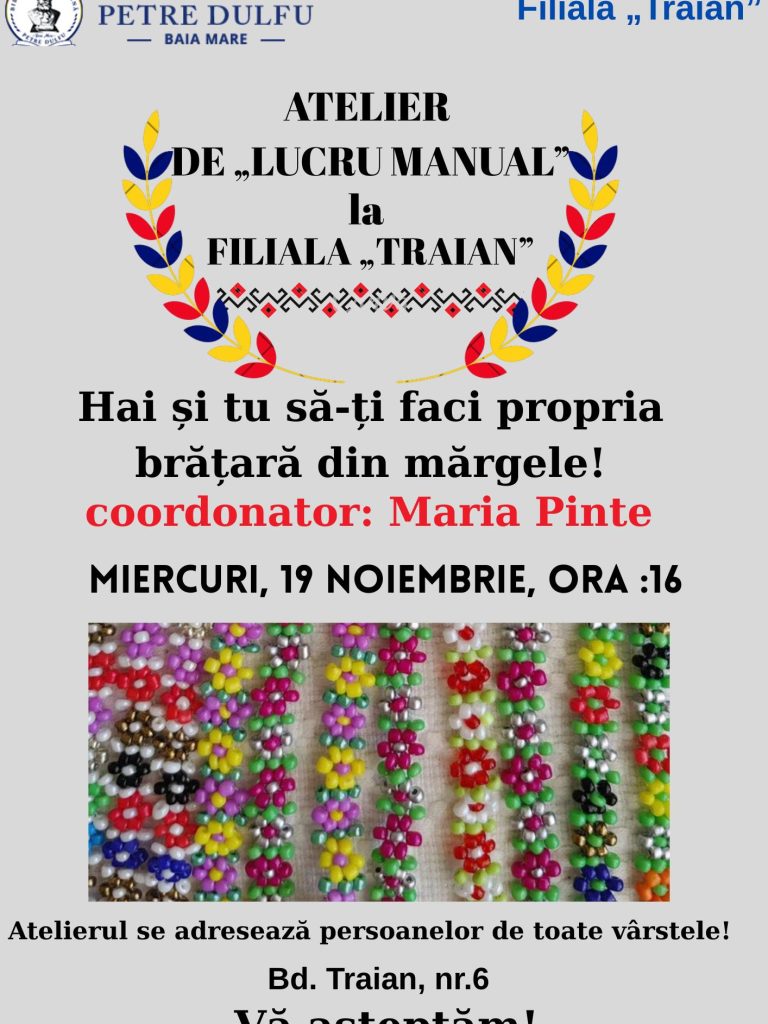 Vă invităm în data de 19 noiembrie, de la ora 16, să veniți vă faceți o brățară din mărgele. Dacă doriți, vă puteți aduce propriile mărgele, dacă nu, avem noi. Maria Pinte și noi, bibliotecarele de la Filiala Traian vă așteptăm să „mărgelim” împreună. Sursa: Biblioteca Judeţeană „Petre Dulfu” Baia Mare, Filiala „Traian” – Bd.…