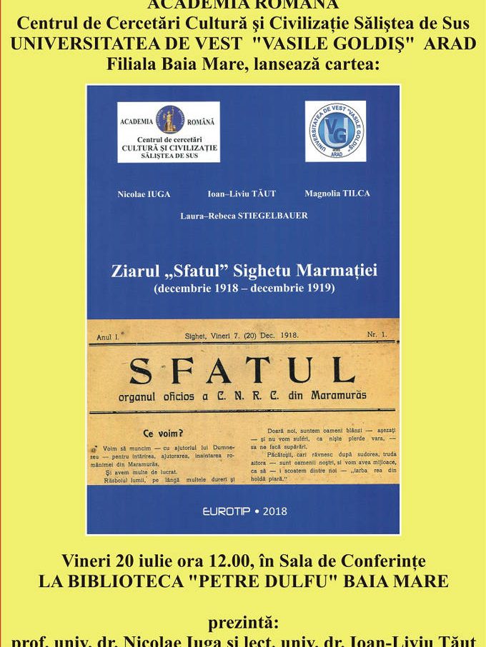 Lansarea volumului: Ziarul ”Sfatul” (1918 – 1919)