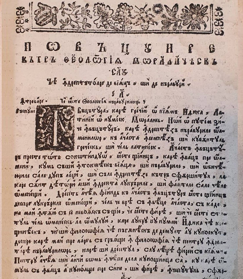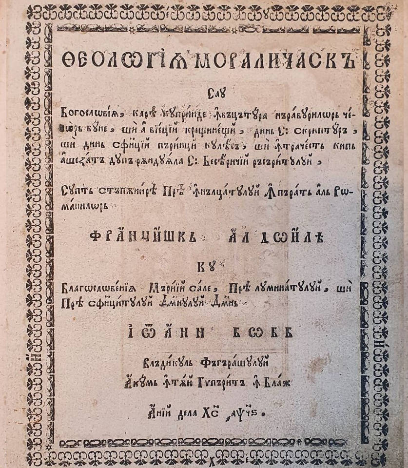 Oglinda paginii de titlu: TEOLOGHIA MORALICEASCĂ / sau / Bogoslovia, carea cuprinde învăţătura năravurilor ce- / lor bune, şi a vieţii creştineşti, din S: Scriptură, / şi din Sfinţii părinţi culeasă, şi întracest chip / aşezată după rânduiala S: Besearecii răsăritului, / Supt stăpânirea Prea înălţatului Înpărat al Ro- / manilor / FRANŢIŞC AL DOILEA / CU / Blagoslovenia Măriii Sale, Prea luminatului, şi / Prea sfinţitului Domnului Domn / IOANN BOBB / Vlădicul Făgăraşului / Acum întâiu Tipărită în Blaj / Anii de la Hs 1796.