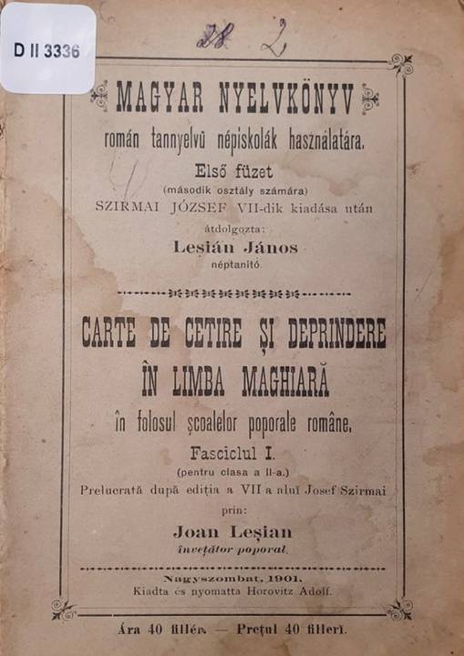 - Carte de cetire şi deprindere în limba maghiară în folosul şcoalelor poporale române – Ioan Leşian, Târnavia, 1901. Cota: D II 3336