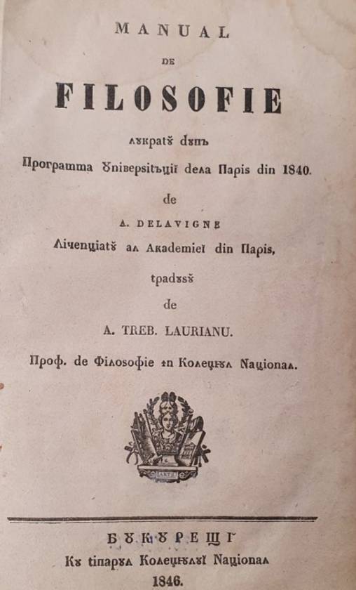 - Manual de filosofie lucratu după Programa Universităţii dela Paris din 1840 – A. Delavine, trad. August Treboniu Laurian, Bucureşti, 1846. Cota: D II 3663