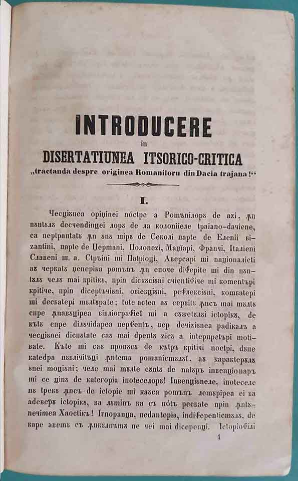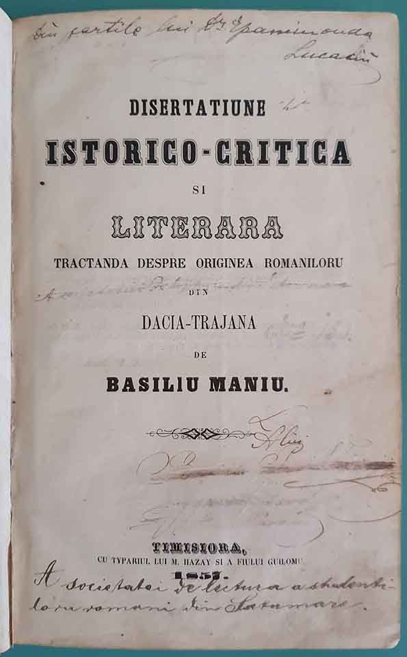 Oglinda paginii de titlu: Disertatiune / istorico-critica / si / literara / tractanda despre originea romaniloru / din / Dacia-Trajana / de / Basiliu Maniu / Timisiora, / Cu Typariul lui M. Hazay si a fiului Guilomu. / 1857.
