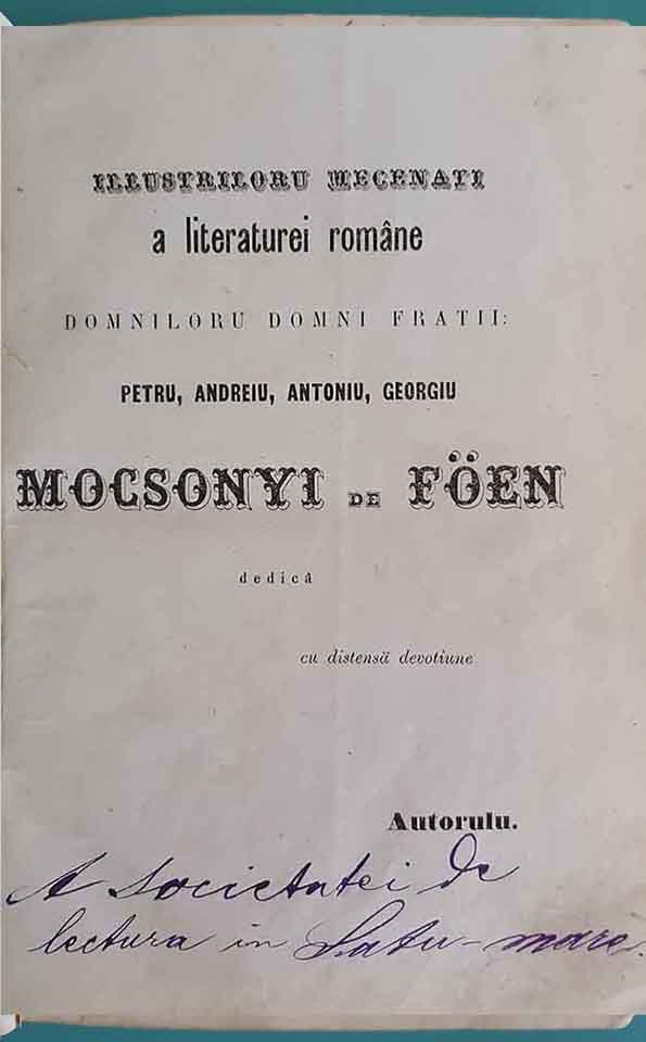 Tot pe pagina de titlu, mărci de proprietate însemnările manuscrise: „Din cărţile lui Dr. Epaminonda / Lucaciu” şi „A societatei de lectură a studenti- / loru români din Satumare.” Exemplar tipărit cu alfabet de tranziție.