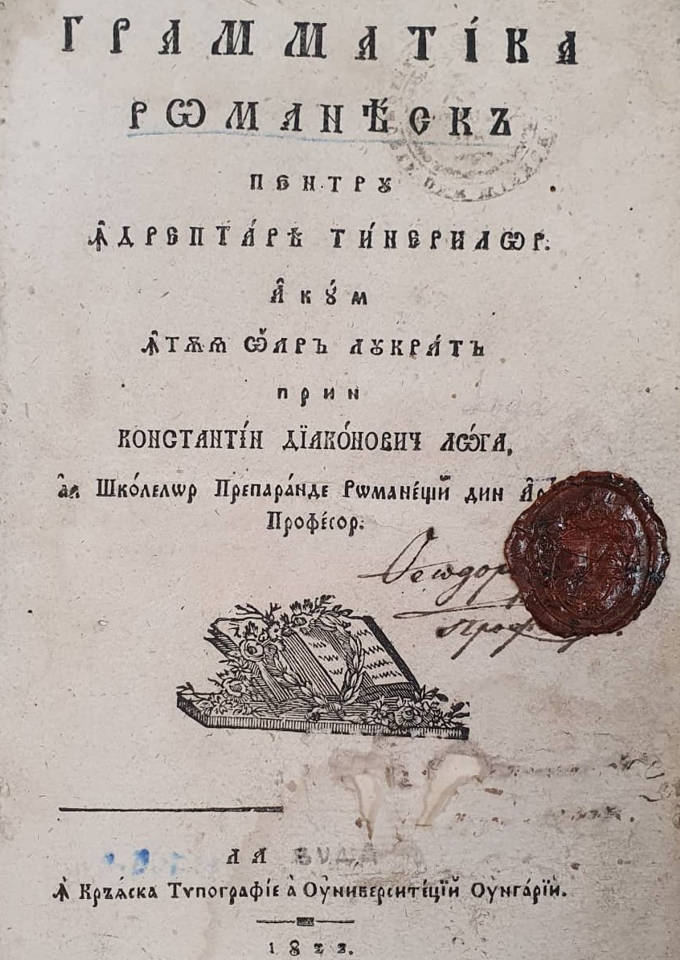 Oglinda paginii de titlu: Gramatica / romanească / pentru / îndreptarea tinerilor / Acum / întîia oară lucrată / prin / Constantin Diaconovici Loga, / al Şcolelor Preparande Romaneşti din Arad / Profesor. / La Buda. / În Crăiasca Tipografie a Universiteţii Ungariii. / 1822.