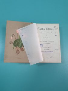 Oglinda paginii de titlu: Herbst-und Winterblumen. / Eine Schilderung der heimischen Blumenwelt / von / Carus Sterne. / Mit 71 Abbildungen in farbendruck / nach der Natur gemalt / von / Jenny Schermaul / und 106 Holzstichen / Prag: F. Tempsky ; Leipszig: G. Freytag 1886.