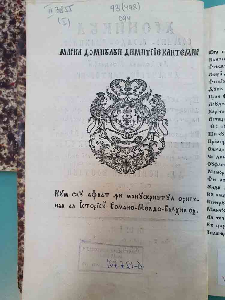Exemplarul este tipărit cu caractere chirilice, ornamentat cu frontispicii, letrine, vignete și motive florale. Pe versoul paginii de titlu se află stema Moldovei cu descrierea: „Marca domnului Dimitrie Cantemir / Cum sau aflat în manuscriptul origin- / nal al Istoriei Romano-Moldo-Vlahilor.”, portretul lui Dimitrie Cantemir [p. 4] ; și o scrisoare a acestuia în facsimil. Legătura este din carton și pânză, iar cotorul din piele imprimat cu litere aurii.