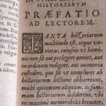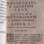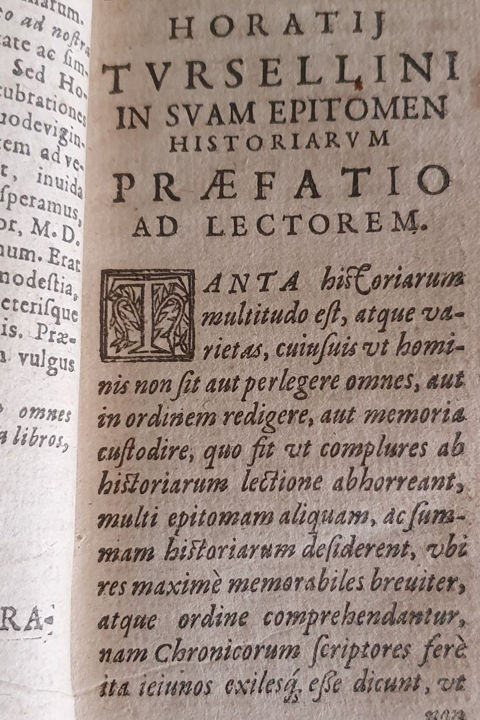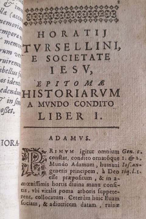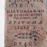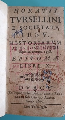 Din patrimoniul Colecțiilor Speciale ale bibliotecii:Oglinda paginii de titlu: HORATII / TURSELLINI / E ‘ SOCIETATE / IESV, / HISTORIARVM / AB ORIGINE MVNDI / usque ad annum 1598. / EPITOMAE / LIBRI X. / DVACI, / Ex Typographia BALTAZARIS BEL- / LERI, sub Circino Aureo, / Anno 1630. / Cum Privilegio.