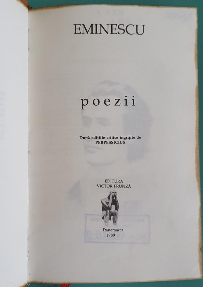 Oglinda paginii de titlu: Eminescu / Poezii / După edițiile critice îngrijite de / Perpessicius / Editura / Victor Frunză / Danemarca / 1989.