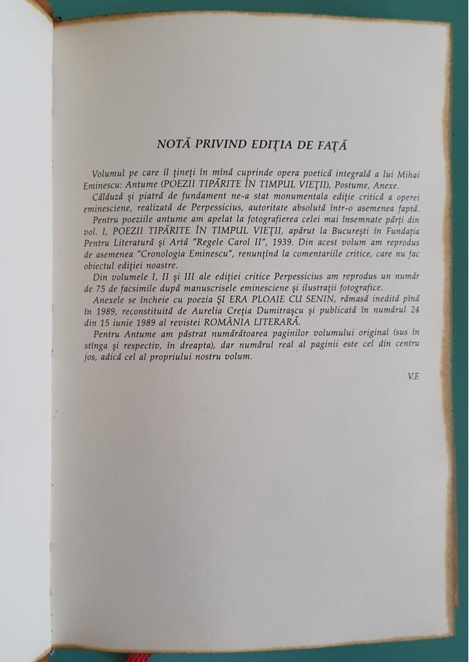 Volumul conține opera poetică integrală a lui Mihai Eminescu, încadrată în trei secțiuni: Antume, Postume și Anexe precum și 75 de facsimile după manuscrise și ilustrații fotografice reproduse după ediția critică îngrijită de Perpessicius, volumele I-III, apărută în 1939. Din acest volum au fost editate un număr de 500 de exemplare, în versiune bibliofilă, pe hârtie filigran specială, legate artizanal în piele maron și având pe coperta I și pe cotor ornamente tipografice imprimate la rece.