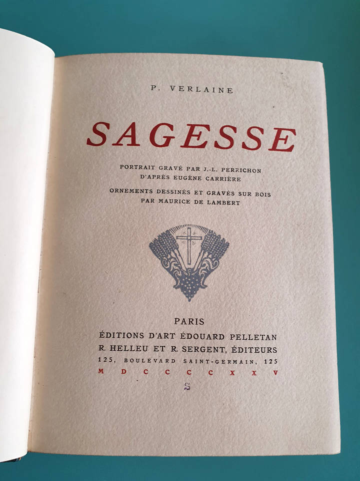 Oglinda paginii de titlu: P. Verlaine / Sagesse / Portrait gravé par J.-L. Perrichon / d`aprés Eugène Carrière / Ornements dessinés et gravés sur bois / par Maurice de Lambert / Paris / Éditions d`art Édouard Pelletan / R. Helleu et R. Sergent, éditeurs / 125, Boulevard Saint-Germain, 125 / MDCCCCXXV.