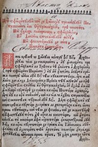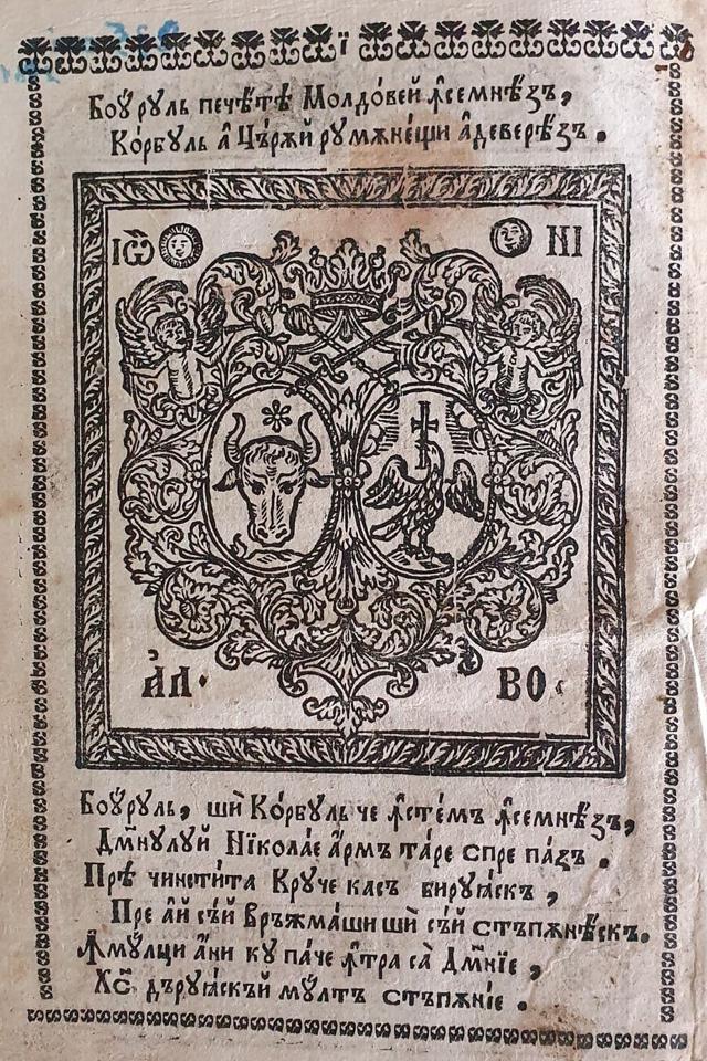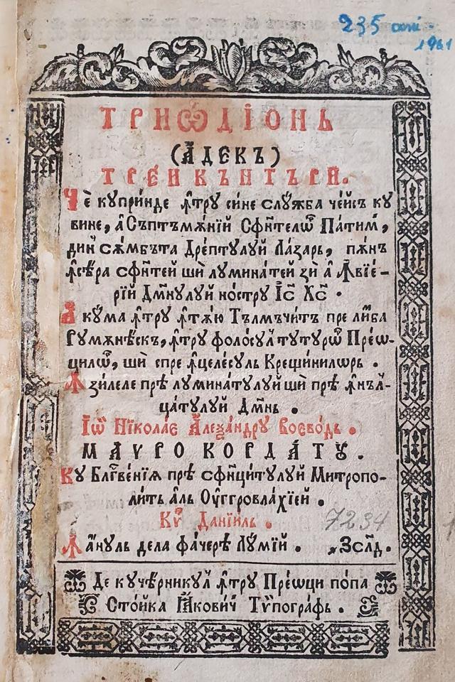 Oglinda paginii de titlu: TRIODION / (adecă) / TREI CĂNTĂRI / ce cuprinde întru sine slujba ceisă cu-/ vine, a Săptămânii Sfintelor Patimi,/ din Sâmbăta dreptului Lazăr, până / în seara sfintei şi luminatei zi a Învie-/ rii Domnului nostru Is Hs./ Acuma întru înâiu Tălmăcită pre limba / Românească, întru folosul tuturor Preo-/ ţilor, şi spre înţelesul Creştinilor./ În zilele prea luminatului şi prea înăl-/ ţatului domn./ Io Nicolae Alexandru Voievod. MAVROCORDATU./ Cu Blagovenia prea sfinţitului Mitropo-/lit al Ungrovlahiei. / Kir Daniil./ În anul de la facerea lumii. 7234 (1726). / De cucernicul întru Preoţi popa / Stoica Iacovici, tipografu.