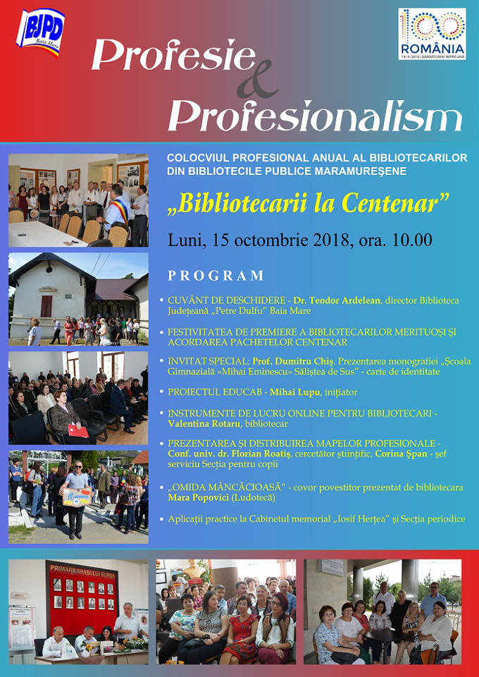 Biblioteca Judeţeană „Petre Dulfu” organizează Colocviul profesional anual al bibliotecarilor din bibliotecile publice maramureşene intitulat „Bibliotecarii la Centenar”.