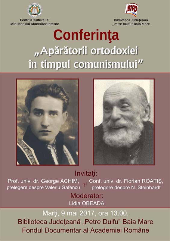 Va avea loc conferinţa cu tema „Apărătorii ortodoxiei în timpul comunismului„, avându-i ca invitaţi pe: prof. univ. dr. George Achim, care va susţine o prelegere despre Valeriu Gafencu şi conf. univ. dr. Florian Roatiş, care va susţine o prelegere despre N. Steinhardt.
