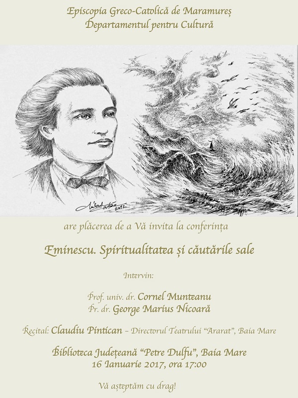 Departamentul pentru Cultură al Episcopiei Greco-Catolice de Maramureş are plăcerea de a vă invita la conferinţa „EMINESCU. Spiritualitatea şi căutările sale”.