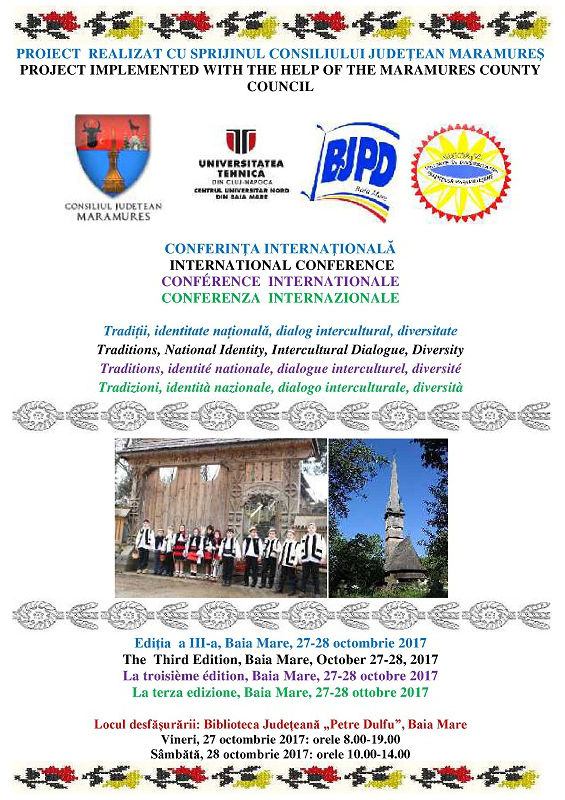 Va avea loc conferinţa internaţională „Tradiţii, identitate naţională, dialog intercultural, diversitate”, ediţia a III-a, 27-28 octombrie 2017, organizată de Facultatea de Litere, specializarea Etnologie a Universităţii Tehnice din Cluj-Napoca, Centrul Universitar Nord Baia Mare.