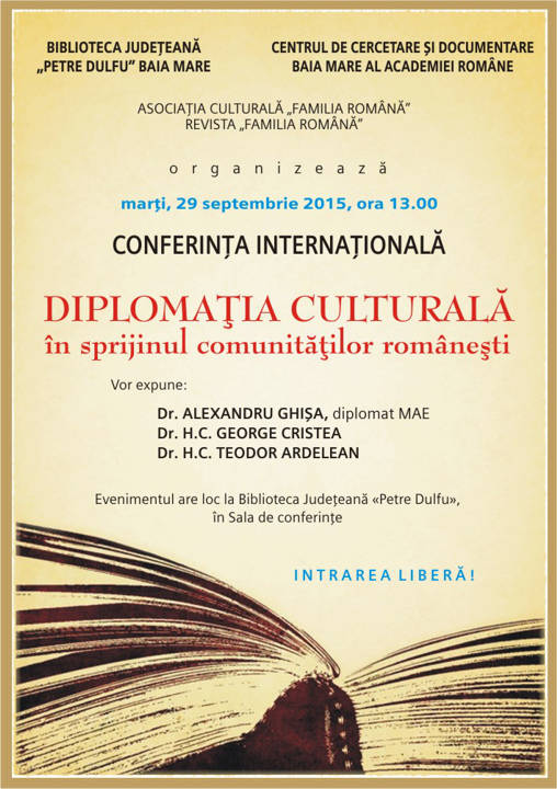 BIBLIOTECA JUDEŢEANĂ „PETRE DULFU” BAIA MARE în colaborare cu CENTRUL DE CERCETARE ŞI DOCUMENTARE BAIA MARE AL ACADEMIEI ROMÂNE, ASOCIAŢIA „FAMILIA ROMÂNĂ” şi REVISTA „FAMILIA ROMÂNĂ” organizează marţi, 29 septembrie 2015, ora 13.00, Conferinţa internaţională DIPLOMAŢIA CULTURALĂ în sprijinul comunităţilor româneşti.
