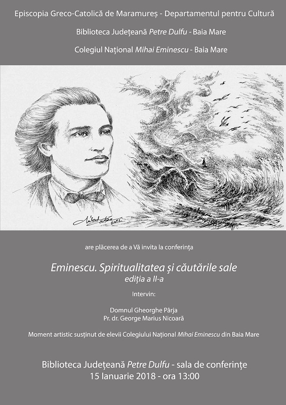 Departamentul pentru Cultură al Episcopiei Greco-Catolice de Maramureş în colaborare cu Biblioteca Judeţeană „Petre Dulfu” şi Colegiul Naţional „Mihai Eminescu” Baia Mare organizează a doua ediţie a conferinţei „Eminescu. Spiritualitatea şi căutările sale”.