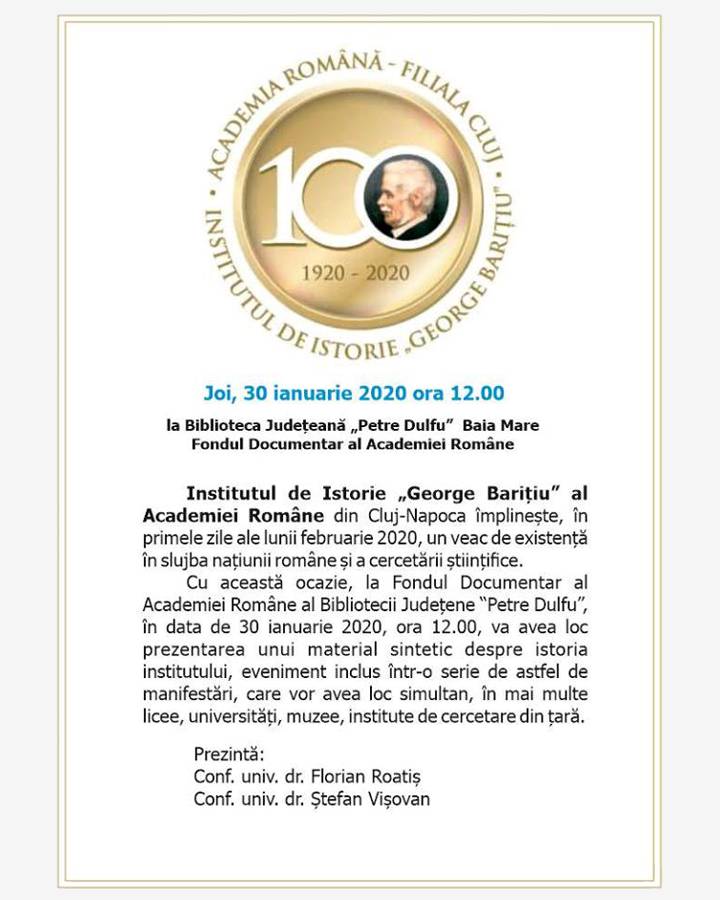 Cu această ocazie, la Fondul Documentar al Academiei Române al Bibliotecii Județene“Petre Dulfu”, în data de 30 ianuarie 2020, ora 12, va avea loc prezentarea unui material sintetic despre istoria institutului, eveniment inclus într-o serie de astfel de manifestări, care vor avea loc simultan, în mai multe licee, universități, muzee, institute de cercetare din țară.