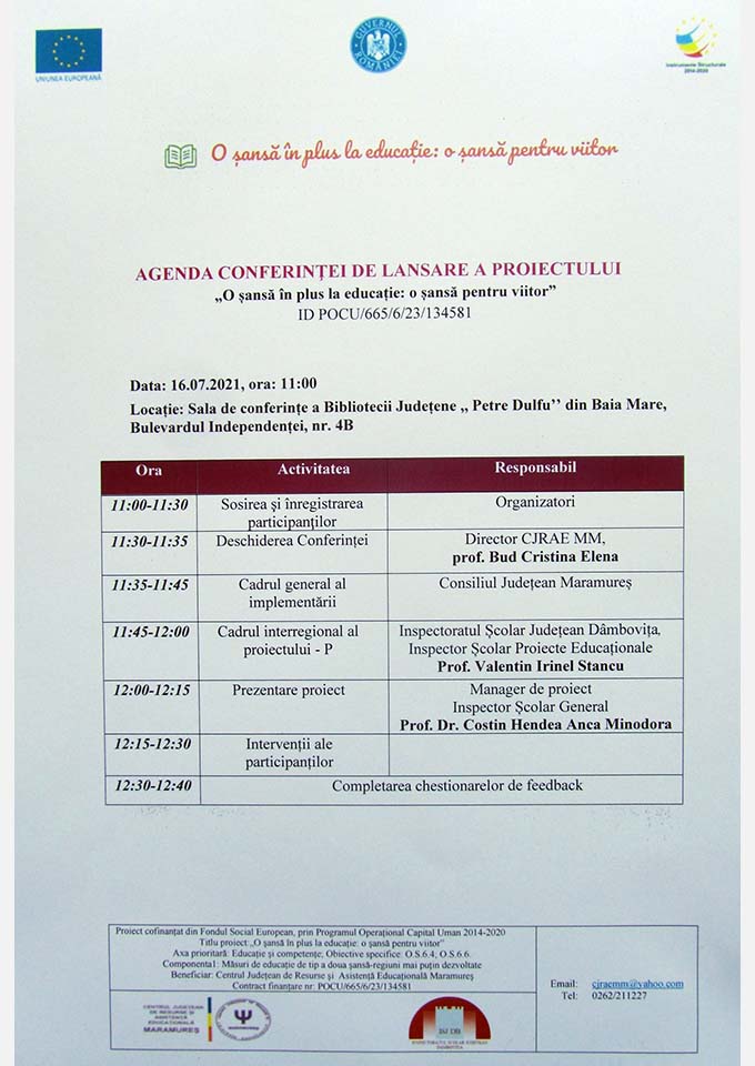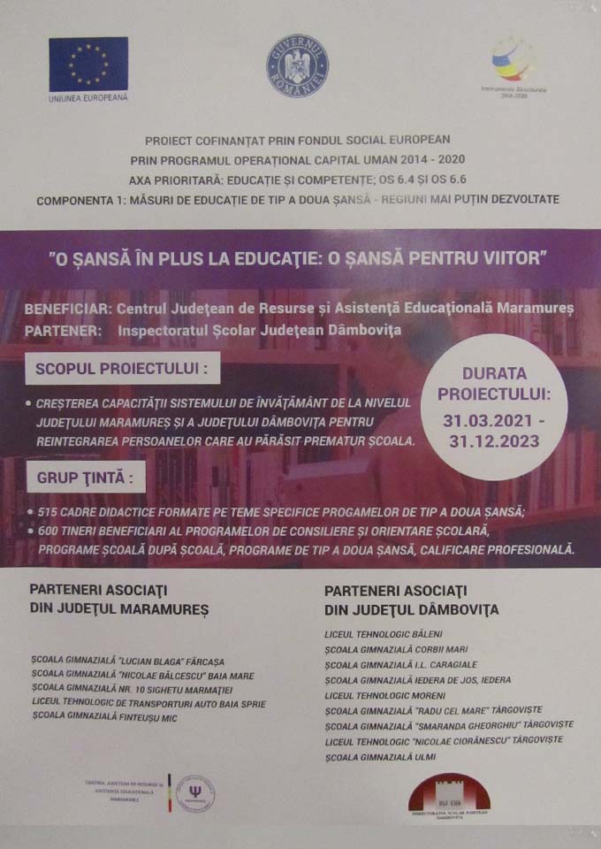 La Biblioteca Judeţenă „Petre Dulfu” a avut loc conferinţa de lansare a proiectului O şansă în plus la educaţie: o şansă pentru viitor, beneficiar Centrul Judeţean de Resurse şi Asistenţă Educaţională Maramureş în parteneriat cu Inspectoratul Şcolar Judeţean Dâmboviţa, proiect ce are ca scop creşterea capacităţii sistemului de învăţământ pentru reintegrarea persoanelor care au părăsit prematur şcoala.