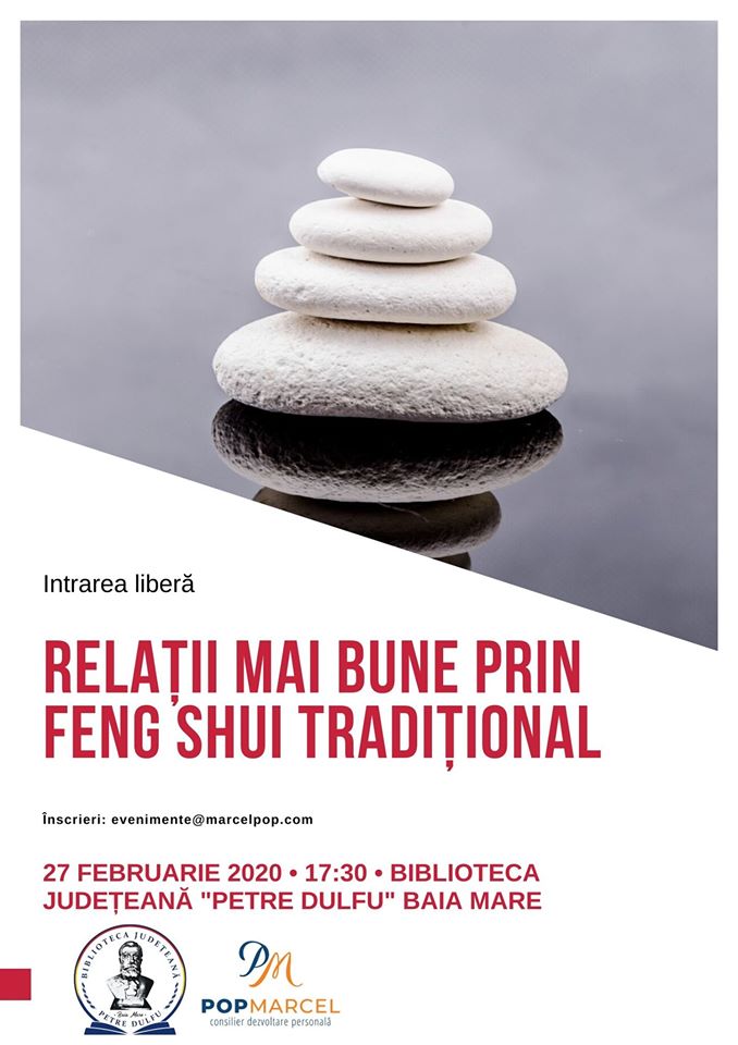 Joi, 27 februarie, de la ora 17.30, în Sala de conferințe, Biblioteca Județeană „Petre Dulfu” organizează conferința ”Relații mai bune prin Feng Shui tradițional”.