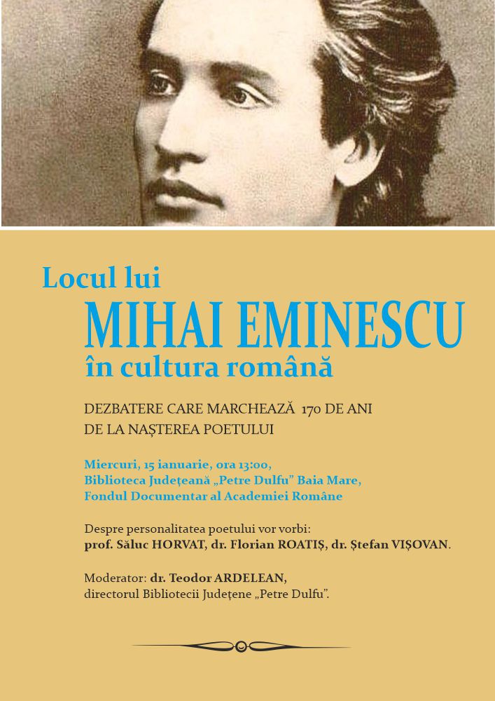 Pentru a marca cei 170 de ani de la nașterea poetului Mihai Eminescu, Biblioteca Județeană “Petre Dulfu” organizează dezbaterea “Locul lui Mihai Eminescu în cultura română”.