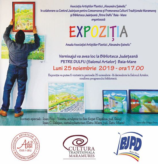 Biblioteca Județeană “Petre Dulfu” în colaborare cu Asociația Artiștilor Plastici “Alexandru Șainelic” și Centrul Județean pentru Conservarea și Promovarea Culturii Tradiționale Maramureș organizează vernisajul expoziției de pictură, ceramică, sculptură cu titlul Anuala Asociației Artiștilor Plastici “Alexandru Șainelic”.