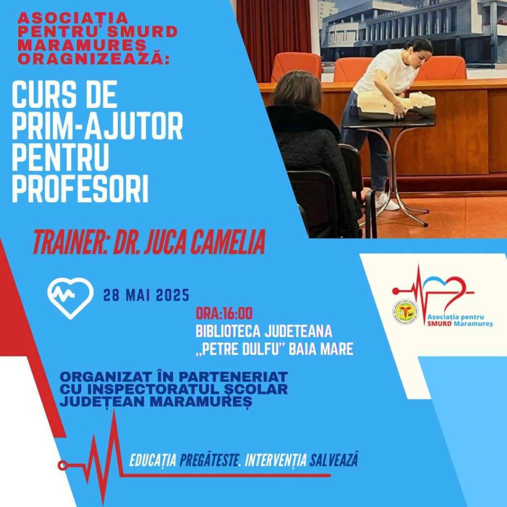 Asociația pentru SMURD, Inspectoratul Școlar Județean Maramureș și Biblioteca Județeană „Petre Dulfu” organizează „Curs de prim-ajutor” pentru profesori.