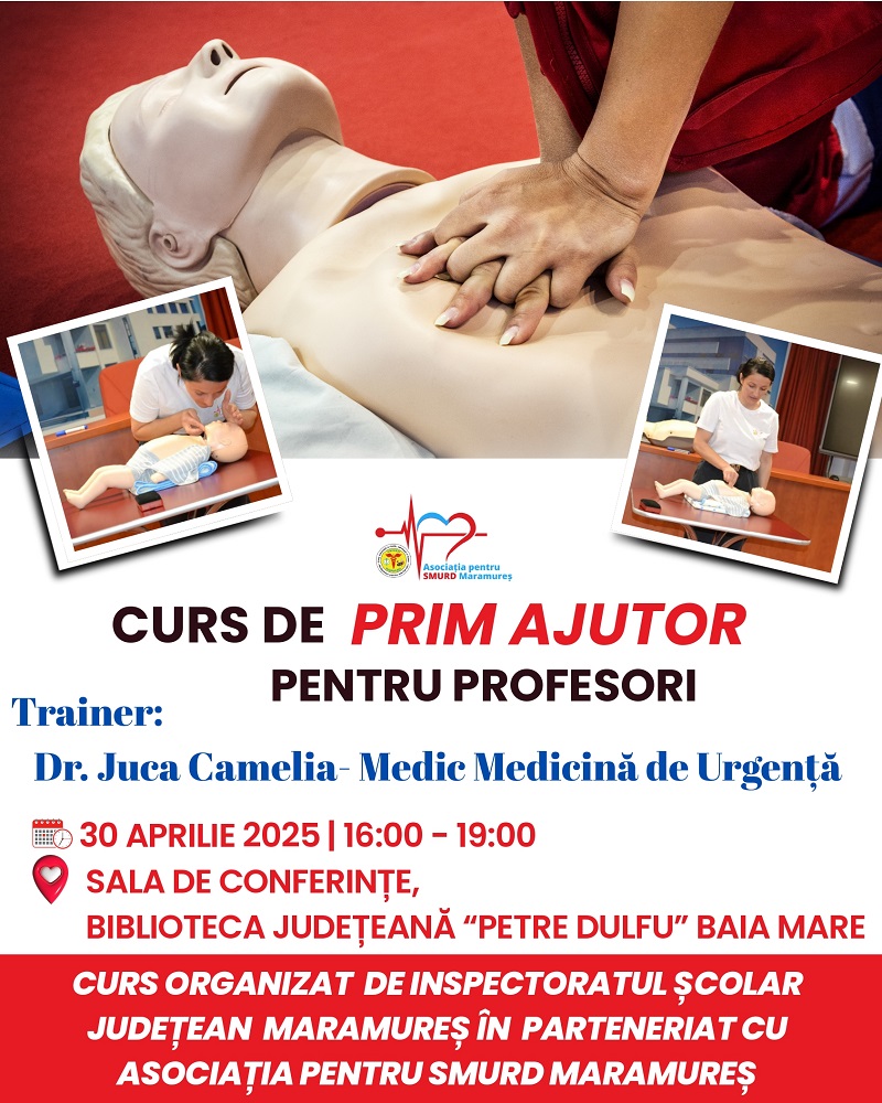 Biblioteca Județeană „Petre Dulfu” în parteneriat cu Asociația pentru SMURD Maramureș și Inspectoratul Școlar Județean Maramureș, organizează un curs de prim-ajutor pentru profesori.