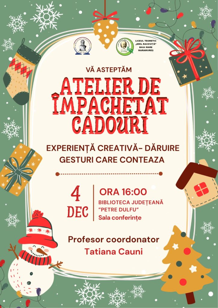 Biblioteca Județeană „Petre Dulfu” în colaborare cu Liceul Teoretic „Emil Racoviță” organizează Atelier de împachetat cadouri. Vor participa elevi de clasa a X-a de la Liceul Teoretic „Emil Racoviță”. Obiectivul atelierului: să transformăm dăruirea cadourilor într-o experiență creativă, atentă și personală, în care elevii învață să ofere cu grijă, nu doar să primească. Ne propunem să dezvoltăm răbdarea, atenția la detalii și bucuria gesturilor mici, dar cu semnificație.