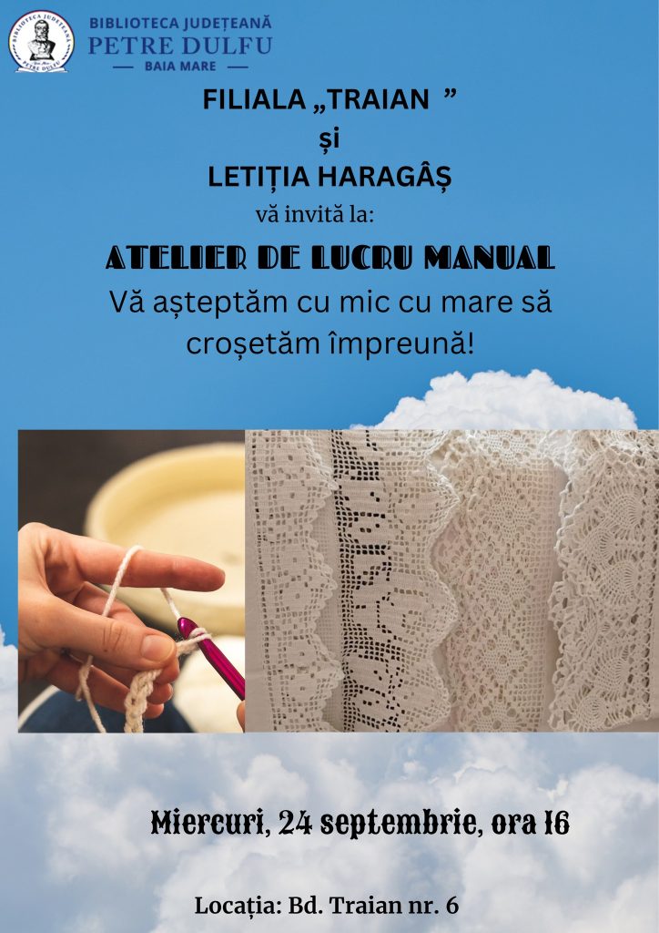 Săptămâna viitoare, miercuri, vă așteptăm să vă alăturați nouă cu mic cu mare să învățăm să croșetăm. Cea care ne va ghida va fi colega noastră Letiția Haragâș, căreia îi mulțumim pentru disponibilitate și implicare.
