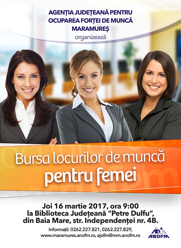 La Salonul Artelor din cadrul Bibliotecii Judeţene „Petre Dulfu” va avea loc “Bursa locurilor de muncă pentru femei”, organizată de Agenţia Judeţeană pentru Ocuparea Forţei de Muncă Maramureş.