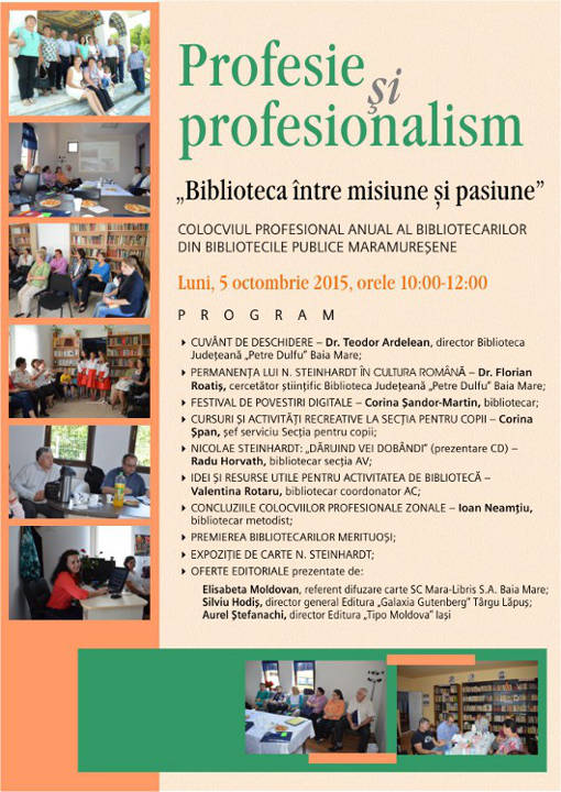 Sub egida „PROFESIE ŞI PROFESIONALISM – BILIOTECA ÎNTRE MISIUNE ŞI PASIUNE„, va avea loc colocviul profesional anual al bibliotecarilor din bibliotecile publice maramureşene.