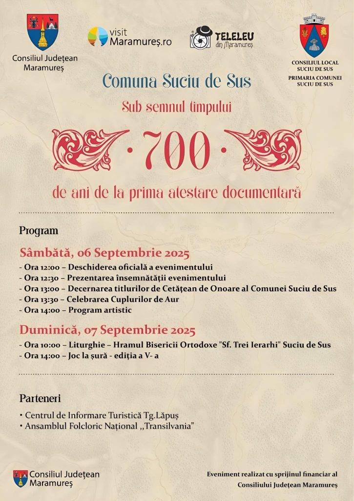 Primăria și Consiliul Local Suciu de Sus organizează o suită de manifestări cu ocazia aniversării a 700 de ani de la prima atestare documentară „Comuna Suciu de Sus sub semnul timpului”.