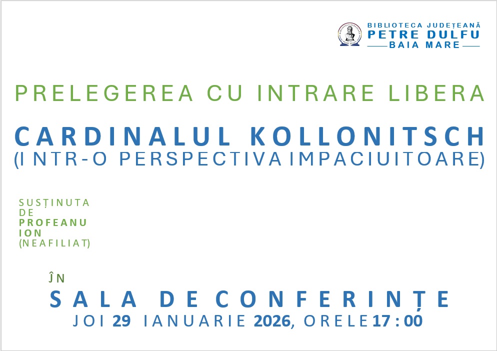 Biblioteca Județeană „Petre Dulfu” Baia Mare organizează conferința „Cardinalul Kollonitsch – în perspectivă împăciuitoare”, susținută de lector Ioan Profeanu, neafiliat.