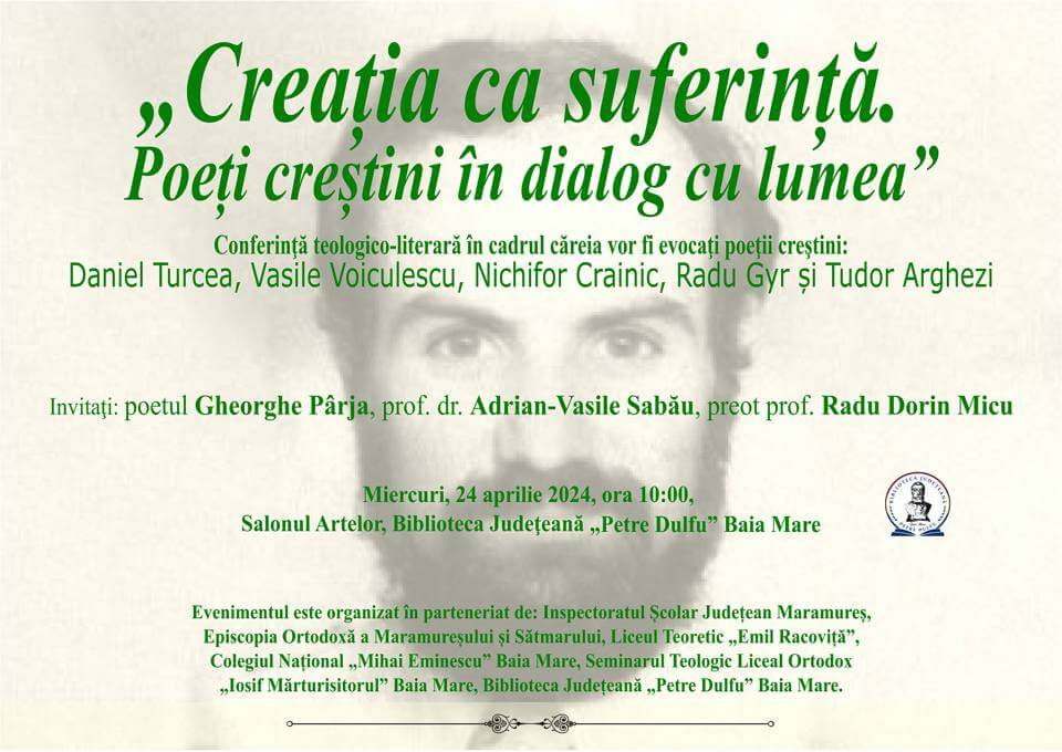 În cadrul proiectului cultural – educațional „Între Creație și Înviere”, va avea loc Conferința „Creația ca suferință. Poeți creștini în dialog cu lumea”. Va avea loc evocarea poeților creștini: Daniel Turcea, Vasile Voiculescu, Nichifor Crainic, Radu Gyr, Tudor Arghezi, atât din perspectiv teologică, cât și din perspectivă literară. Vor avea loc recitaluri de poezie pe versurile poeților menționați, precum și o expoziție tematică de desene ale elevilor. Scopul proiectului este crearea unei deschideri religios-culturale pentru elevii și profesorii de liceu, dincolo de tiparul rigid al programei școlare, stimularea creativității, precum și conștientizarea adolescenților cu privire la implicarea în activități caritabile și de voluntariat.