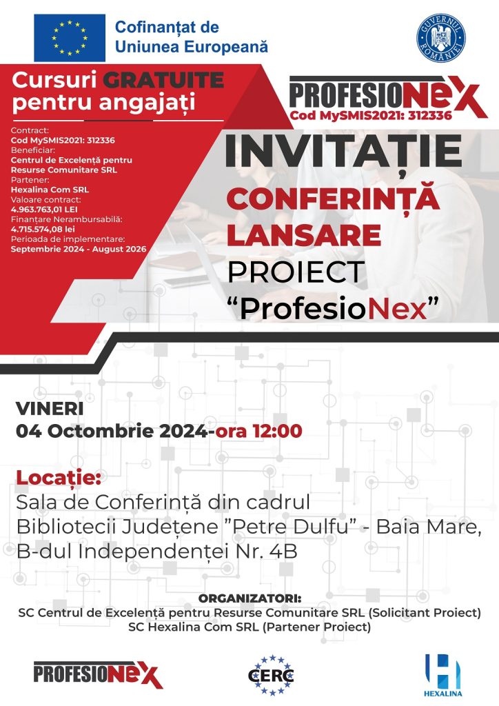 Centrul de Excelență pentru Resurse Comunitare SRL Baia Mare în colaborare cu Hexalina SRL și Biblioteca Județeană „Petre Dulfu” organizează conferința de lansare a proiectului „ProfesioNEX”.